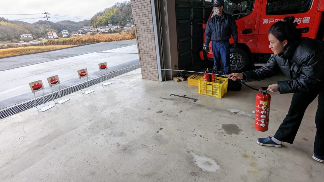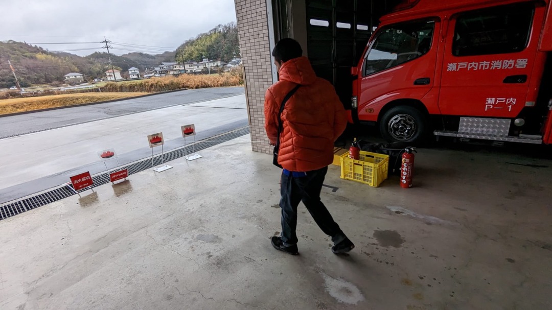天気が悪い中ではありますが、瀬戸内消防署で見学と消火体験をさせてもらいました。