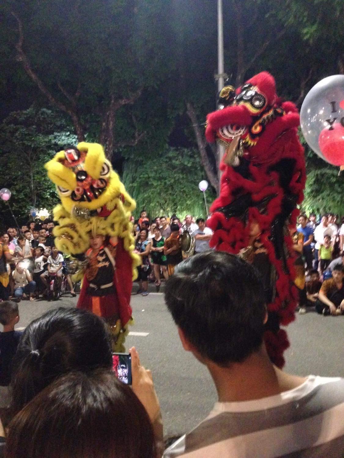 獅子舞いは中秋節の見どころの一つになります。男性2人がそれぞれ獅子舞の獅子頭と胴体の部分を被りながら獅子の動きのように踊ります。