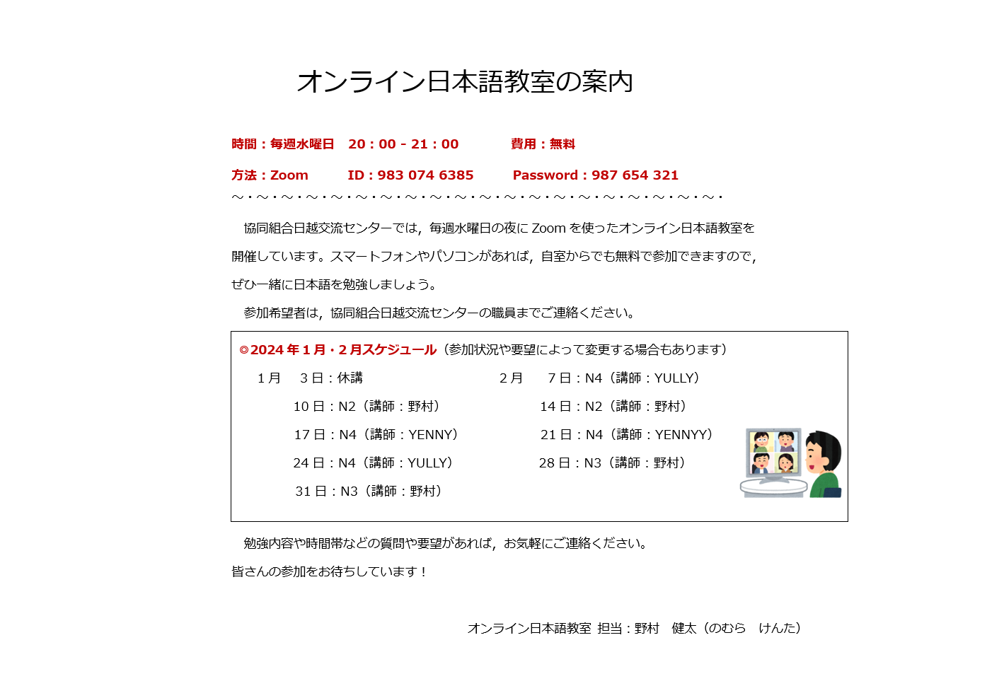 日越交流センターでは,毎週水曜日の20:00~21:00でZoomを使ったオンライン日本語教室を開催しています。