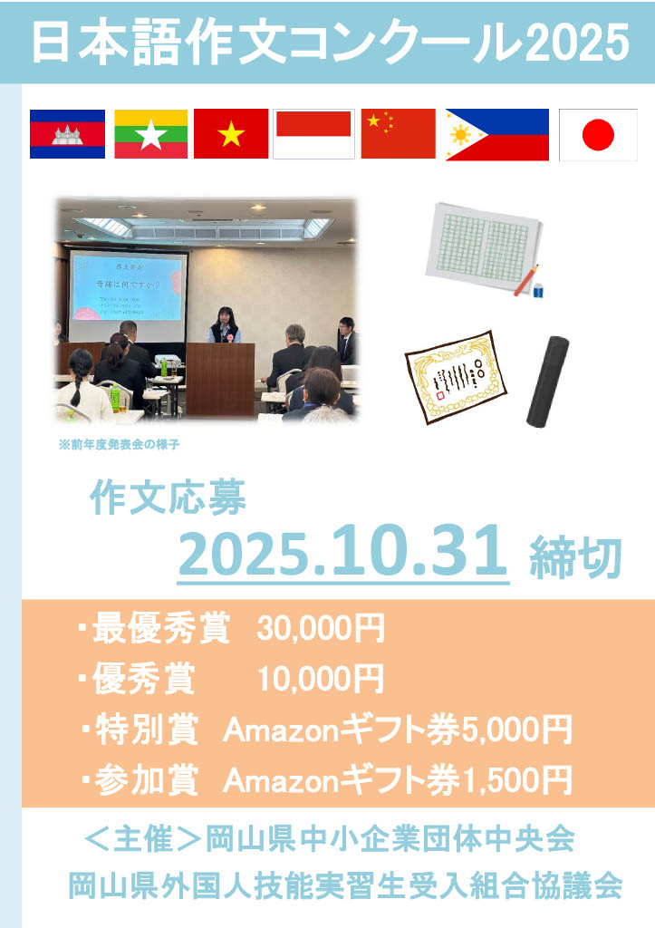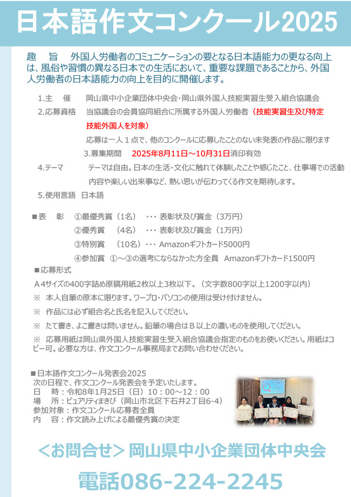 ⑤応募作品の著作権は岡山県外国人技能実習生受入組合協議会に帰属します。