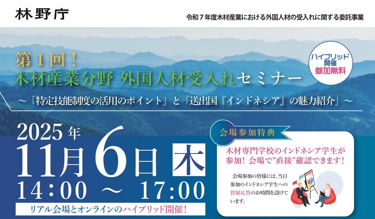 林野庁主催で、木材産業特定技能外国人材受入セミナーが実施されます。